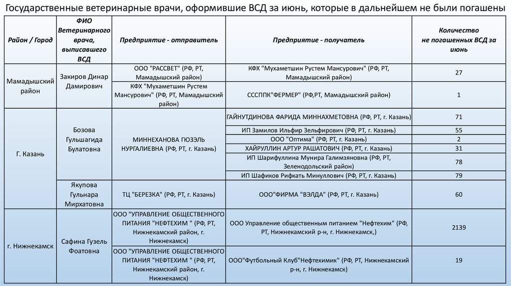Государственные ветеринарные врачи, оформившие ВСД за июнь, которые в дальнейшем не были погашеныФИО