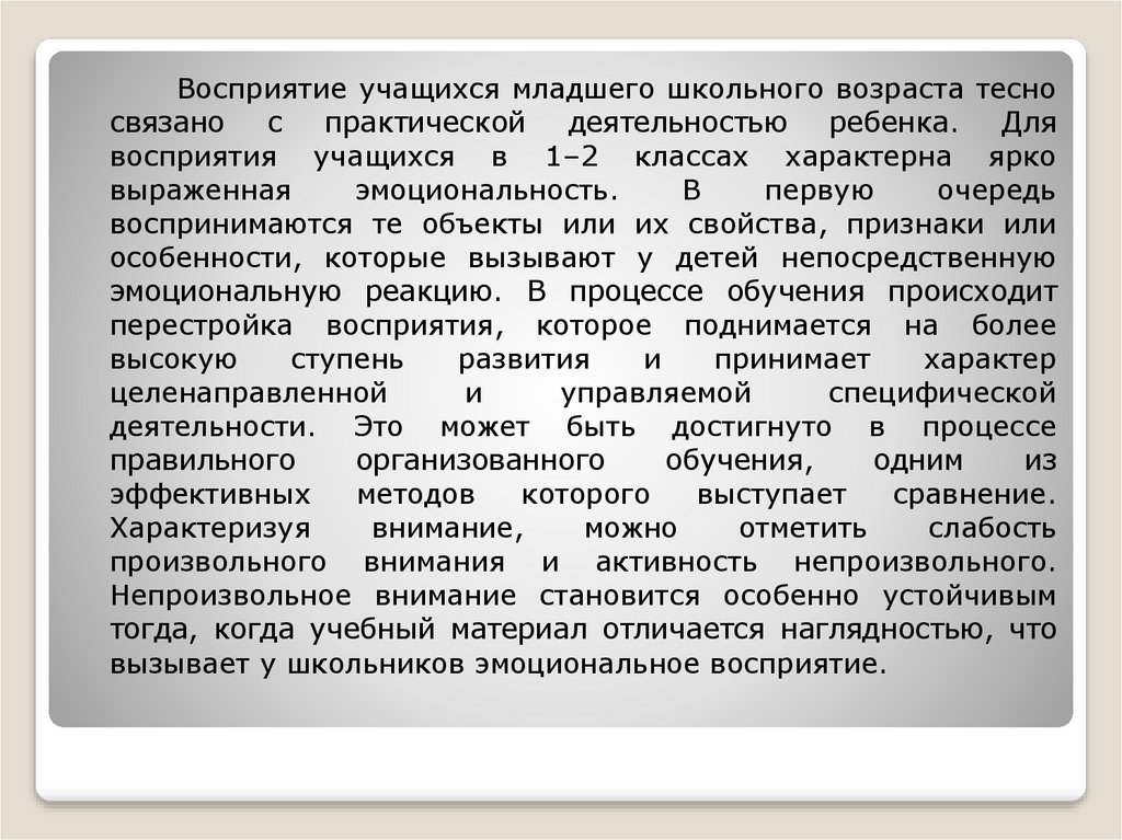 Восприятие учащихся младшего школьного возраста тесносвязано с практической деятельностью ребенка. Для