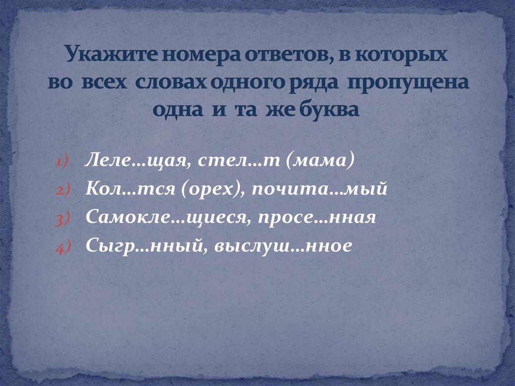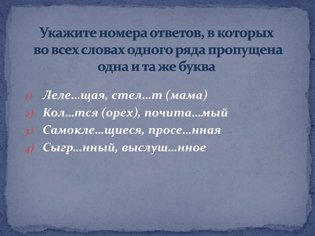 1) Леле…щая, стел…т (мама)2) Кол…тся (орех), почита…мый