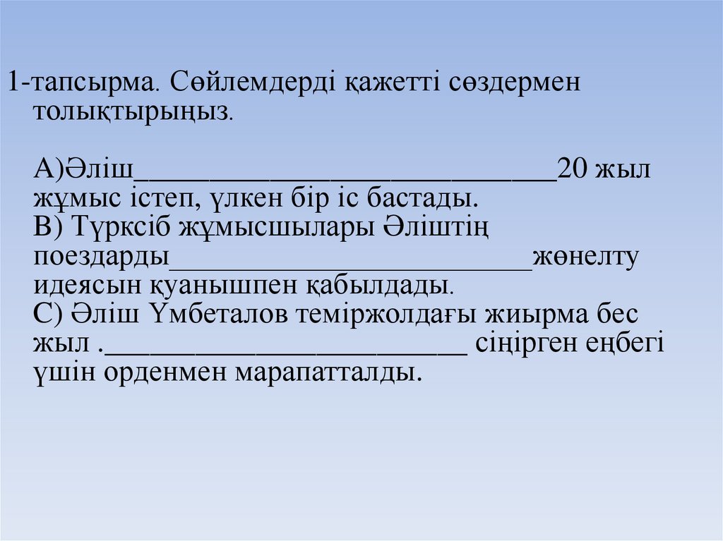 1-тапсырма. Сөйлемдерді қажетті сөздерментолықтырыңыз.