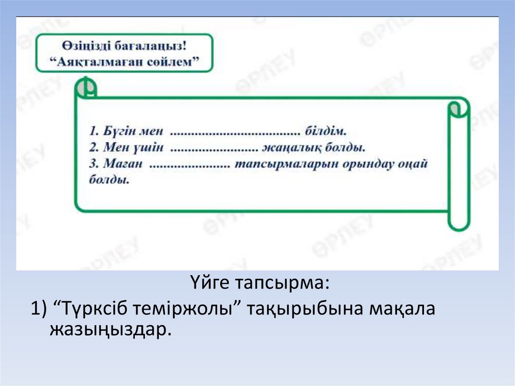 Үйге тапсырма:1) “Түрксіб теміржолы” тақырыбына мақала