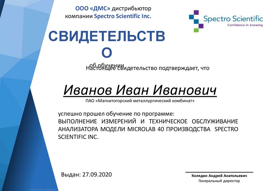 ООО «ДМС» дистрибьютор компании Spectro Scientific Inc. Свидетельство об обучении. Шаблон