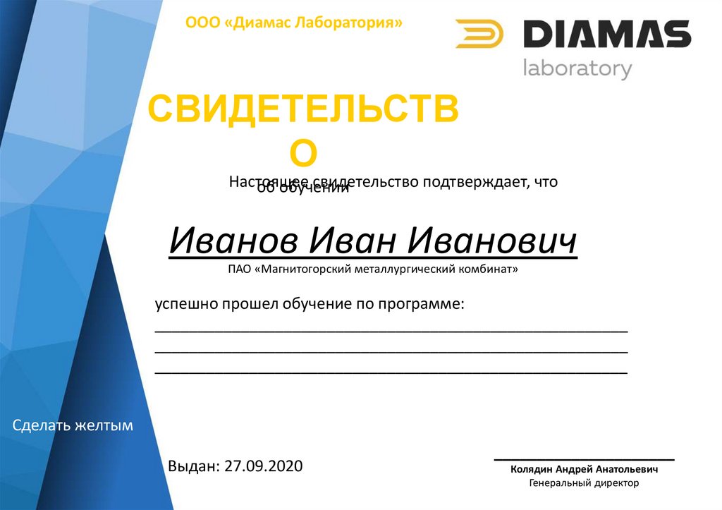ООО «Диамас Лаборатория»СВИДЕТЕЛЬСТВ