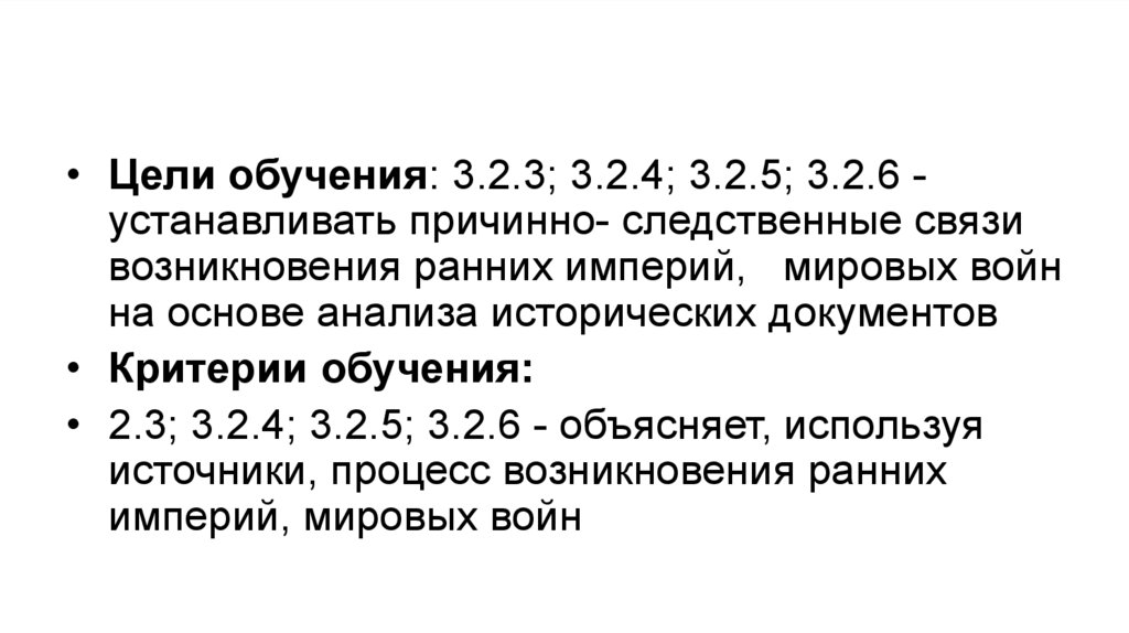 • Цели обучения: 3.2.3; 3.2.4; 3.2.5; 3.2.6 устанавливать причинно- следственные связивозникновения ранних империй, мировых войн