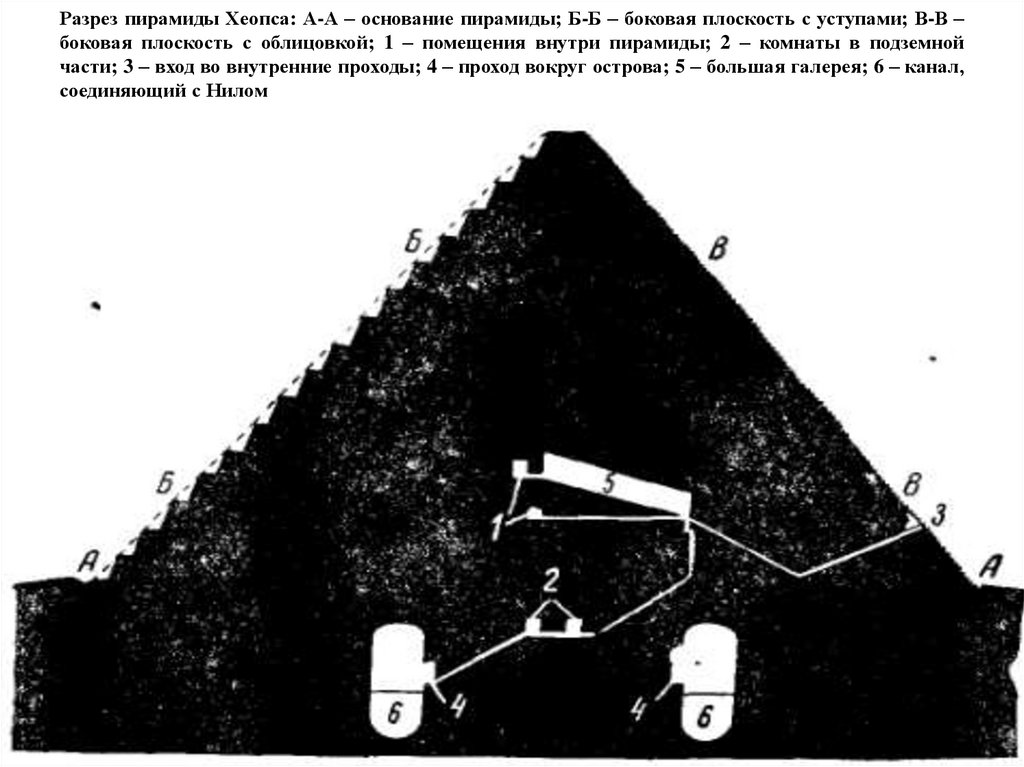 Разрез пирамиды Хеопса: А-А – основание пирамиды; Б-Б – боковая плоскость с уступами; В-В –боковая плоскость с облицовкой; 1 – помещения внутри пирамиды; 2 – комнаты в подземной