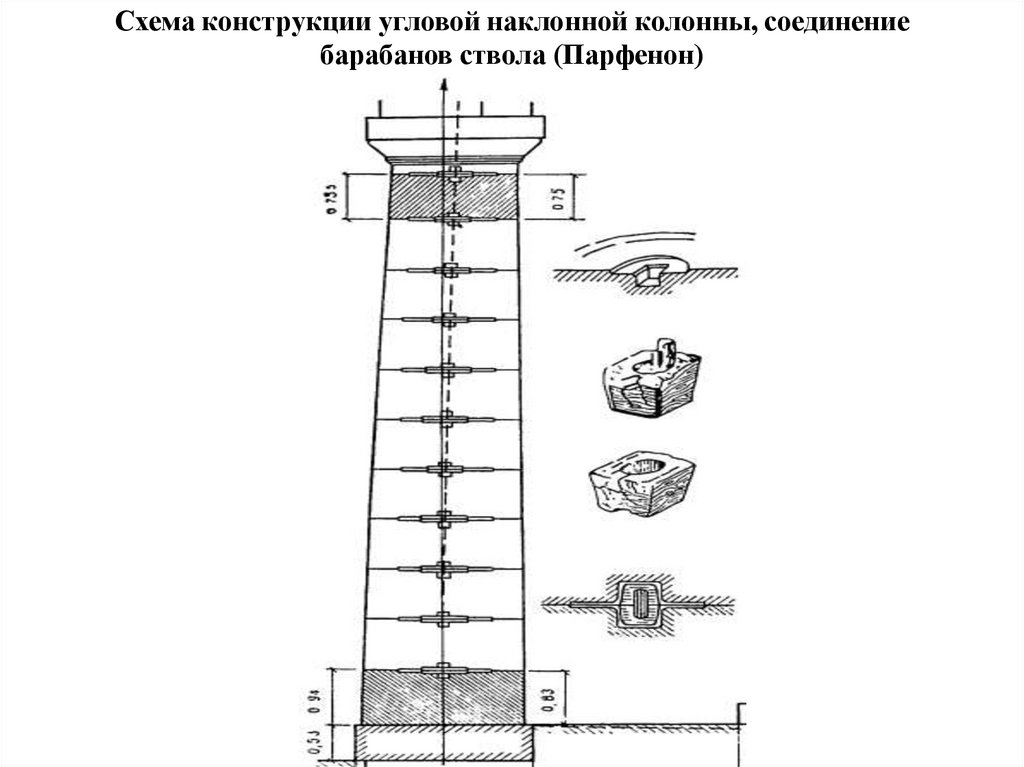 Схема конструкции угловой наклонной колонны, соединениебарабанов ствола (Парфенон)
