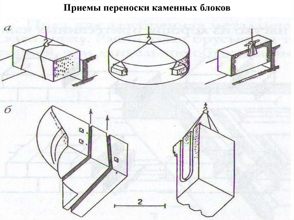 Приемы перемещения каменных блоков: а – различные стадии подъема блоков;б – то же, перемещения