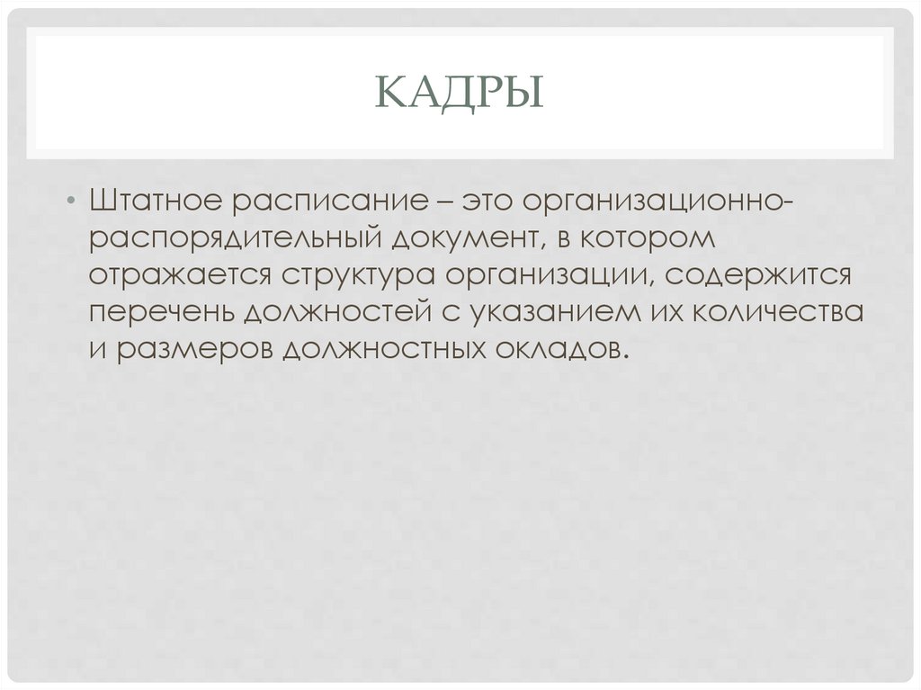 КАДРЫ• Штатное расписание – это организационнораспорядительный документ, в котором