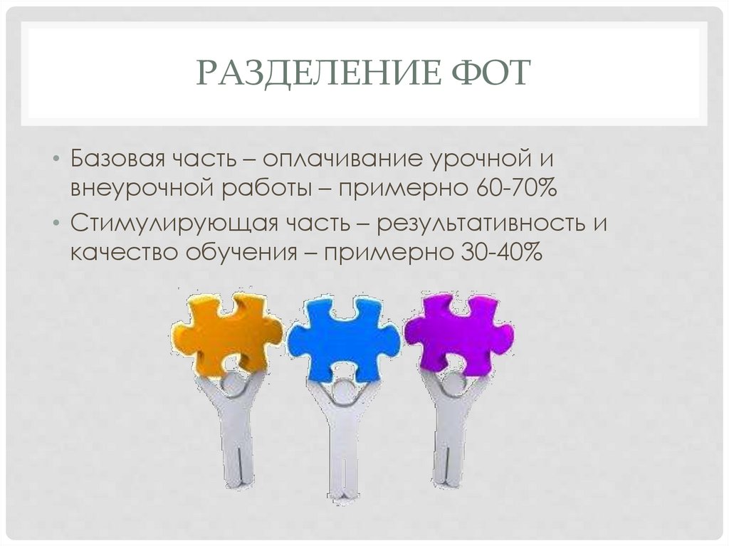 РАЗДЕЛЕНИЕ ФОТ• Базовая часть – оплачивание урочной и
