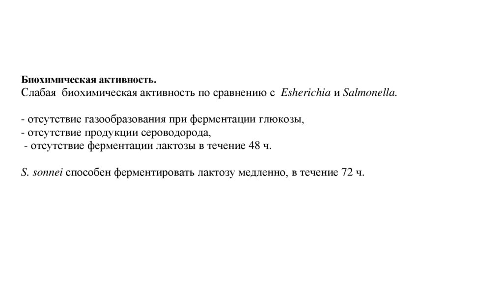 Биохимическая активность.Слабая биохимическая активность по сравнению с Esherichia и Salmonella.