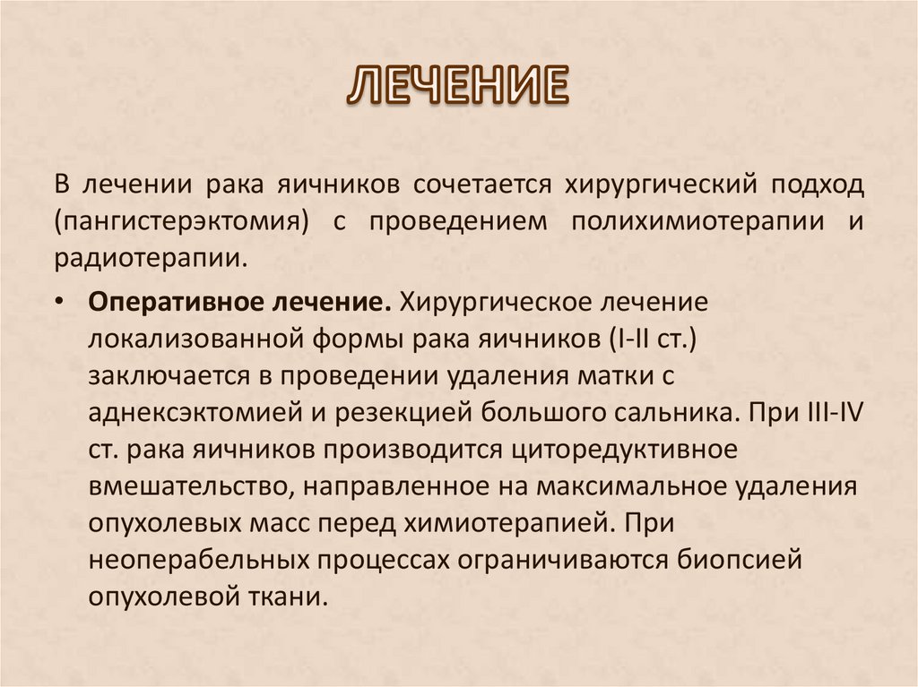 В лечении рака яичников сочетается хирургический подход(пангистерэктомия) с проведением полихимиотерапии и