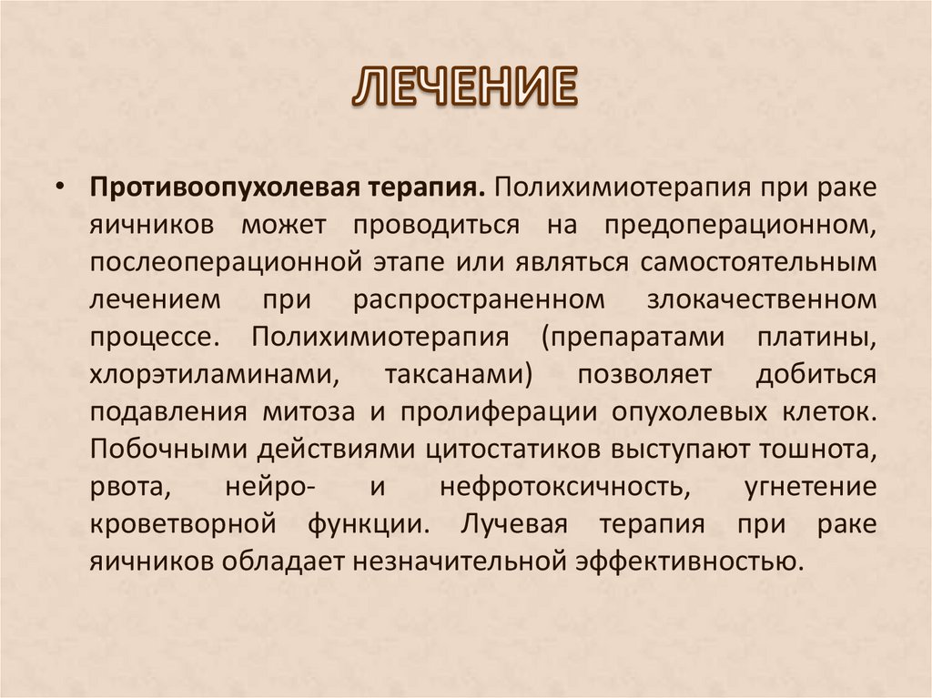 • Противоопухолевая терапия. Полихимиотерапия при ракеяичников может проводиться на предоперационном,