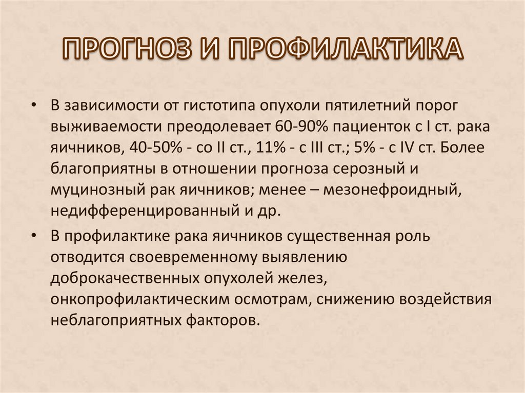 • В зависимости от гистотипа опухоли пятилетний порогвыживаемости преодолевает 60-90% пациенток с I ст. рака