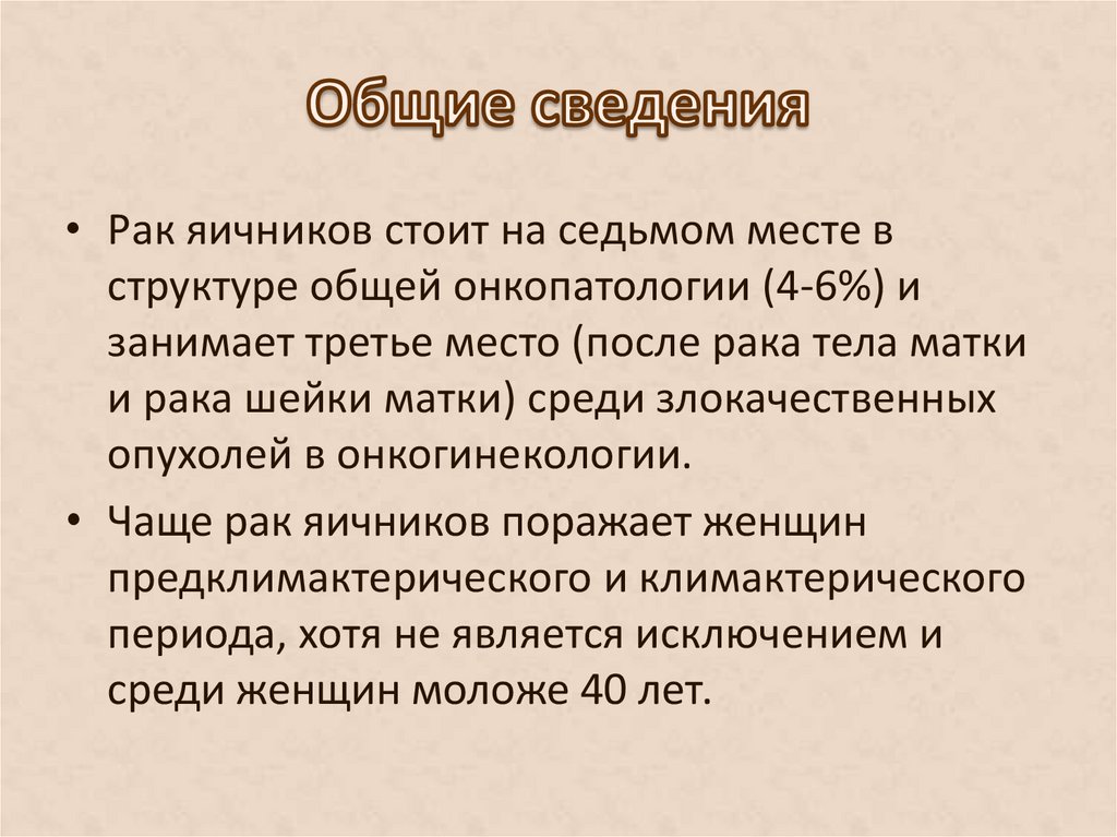 • Рак яичников стоит на седьмом месте вструктуре общей онкопатологии (4-6%) и