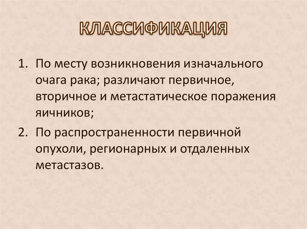 1. По месту возникновения изначальногоочага рака; различают первичное,