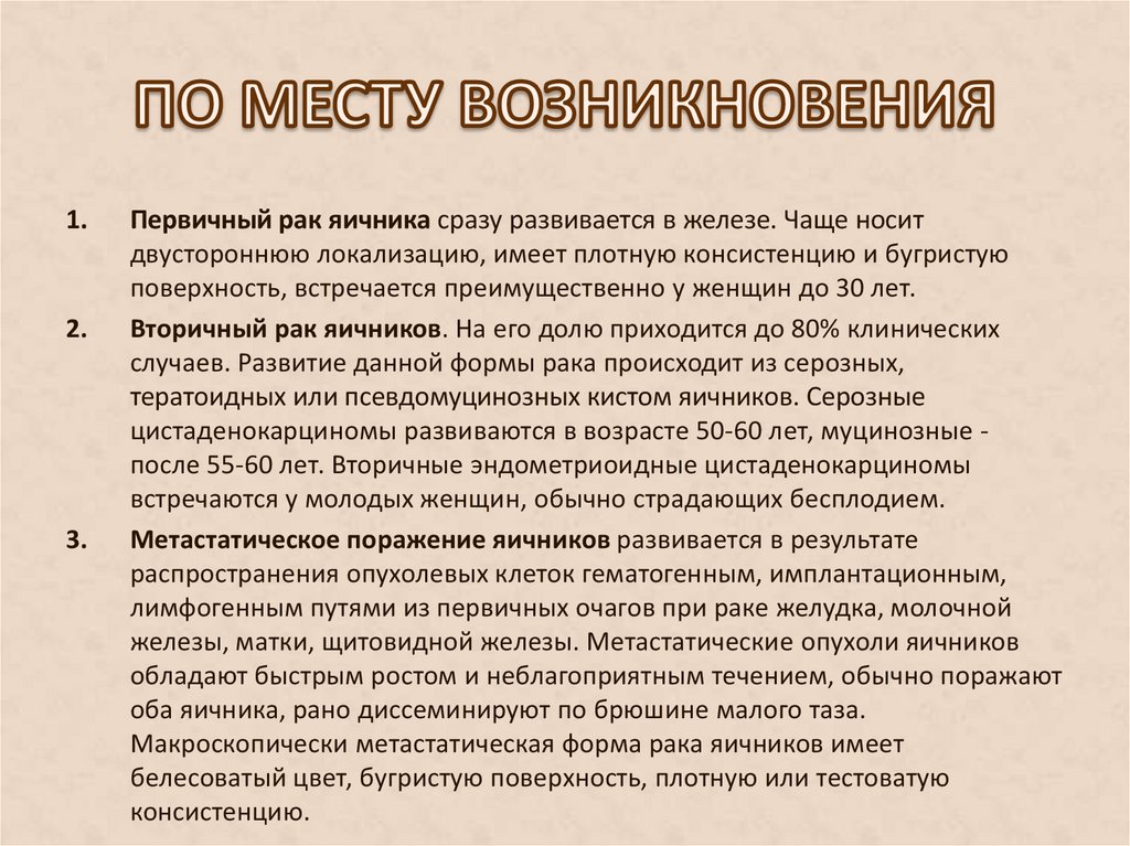 цистаденокарциномы развиваются в возрасте 50-60 лет, муцинозные после 55-60 лет. Вторичные эндометриоидные цистаденокарциномы