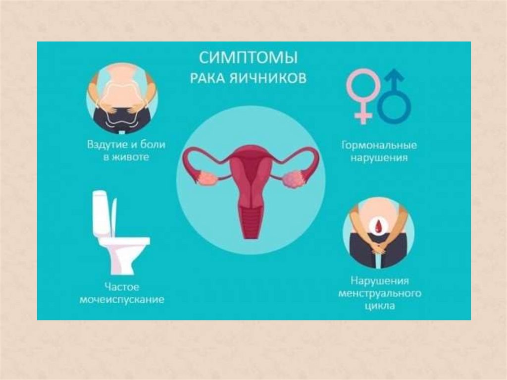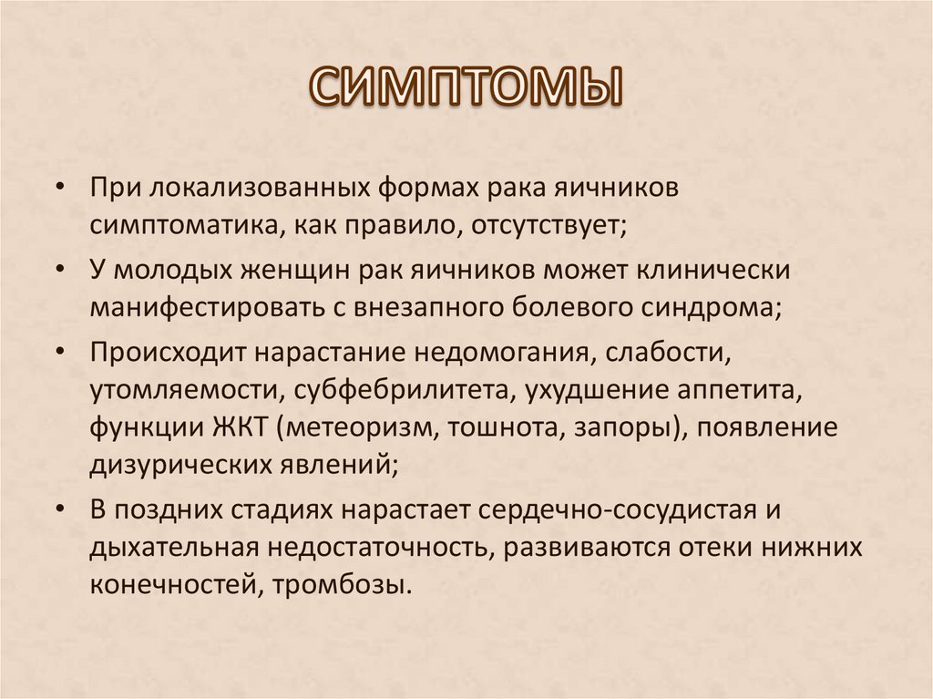 • При локализованных формах рака яичниковсимптоматика, как правило, отсутствует;