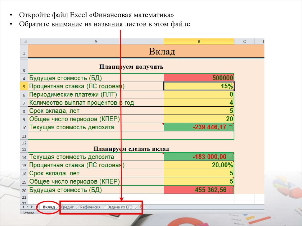• Откройте файл Excel «Финансовая математика»• Обратите внимание на названия листов в этом файле