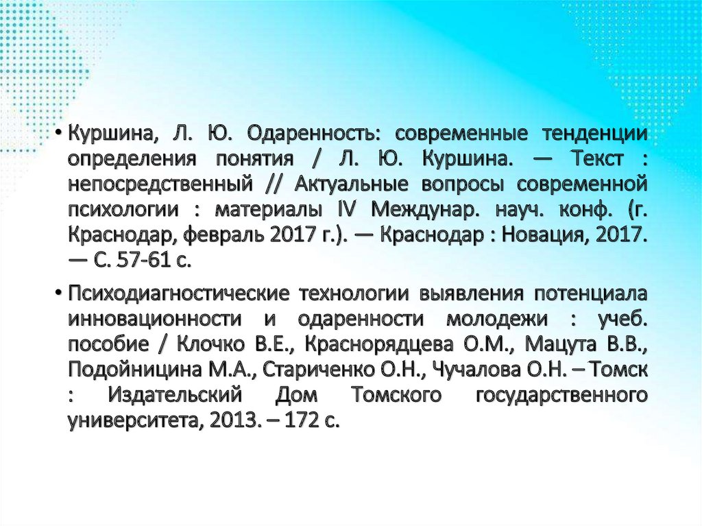 • Куршина, Л. Ю. Одаренность: современные тенденцииопределения понятия / Л. Ю. Куршина. — Текст :