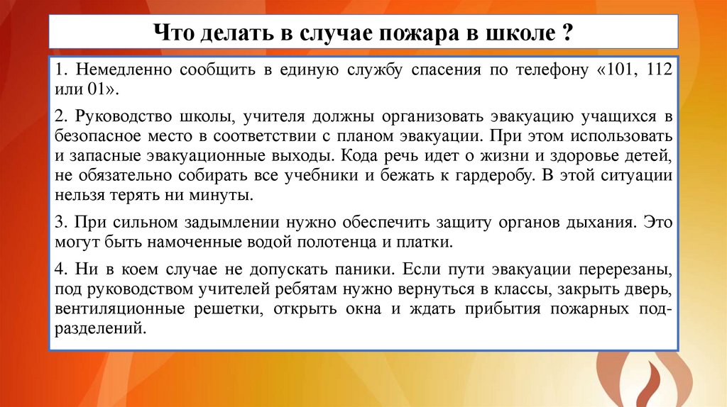 Что делать в случае пожара в школе ?1. Немедленно сообщить в единую службу спасения по телефону «101, 112