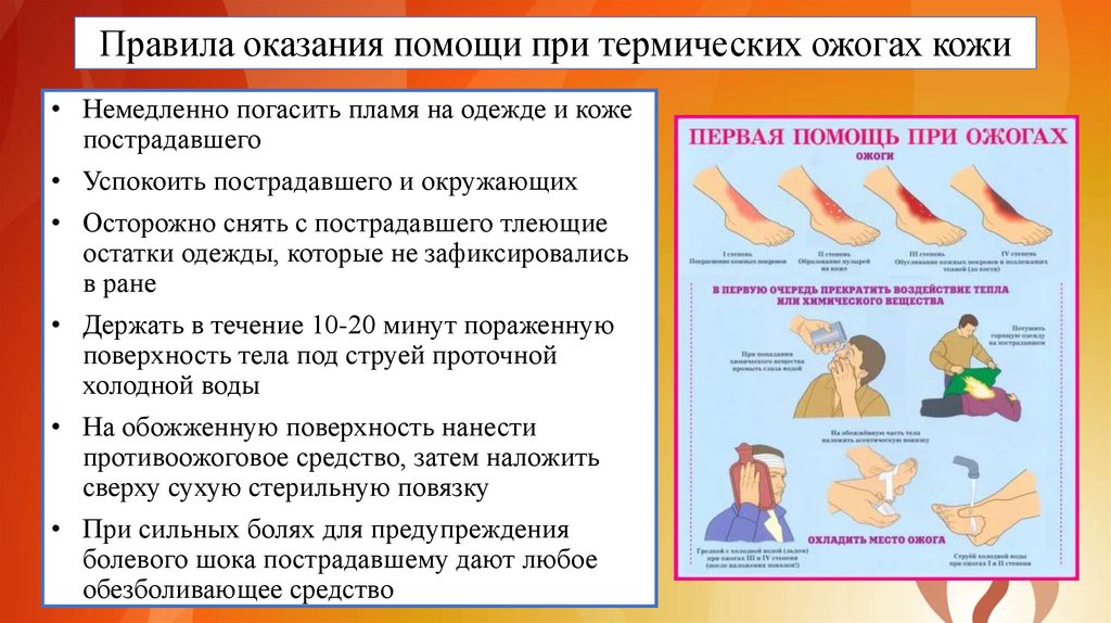 Правила оказания помощи при термических ожогах кожи• Немедленно погасить пламя на одежде и коже