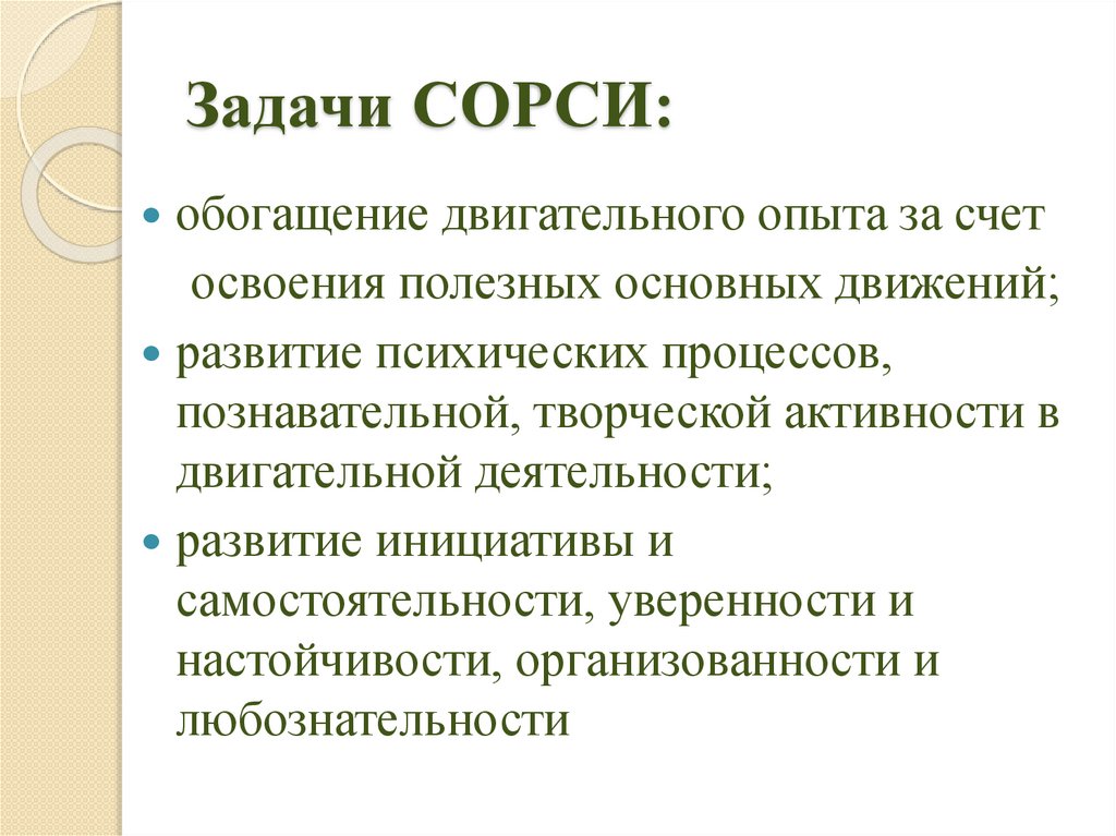 Задачи СОРСИ:обогащение двигательного опыта за счет