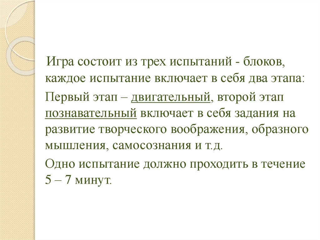 Игра состоит из трех испытаний - блоков,каждое испытание включает в себя два этапа: