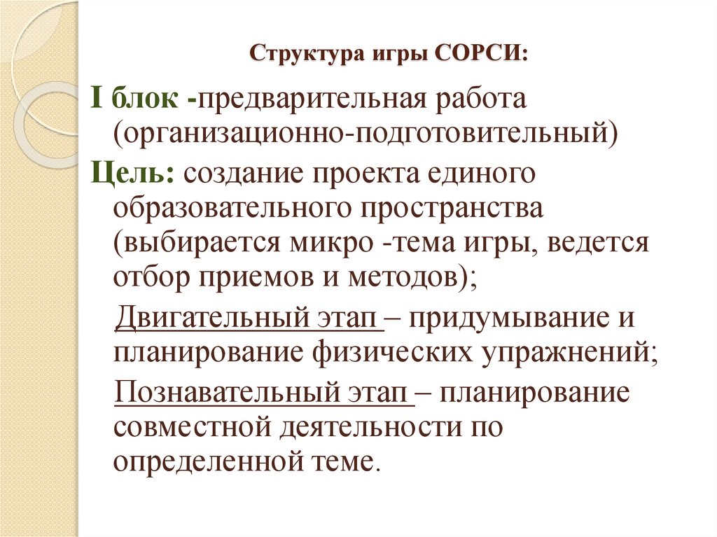 Структура игры СОРСИ:I блок -предварительная работа
