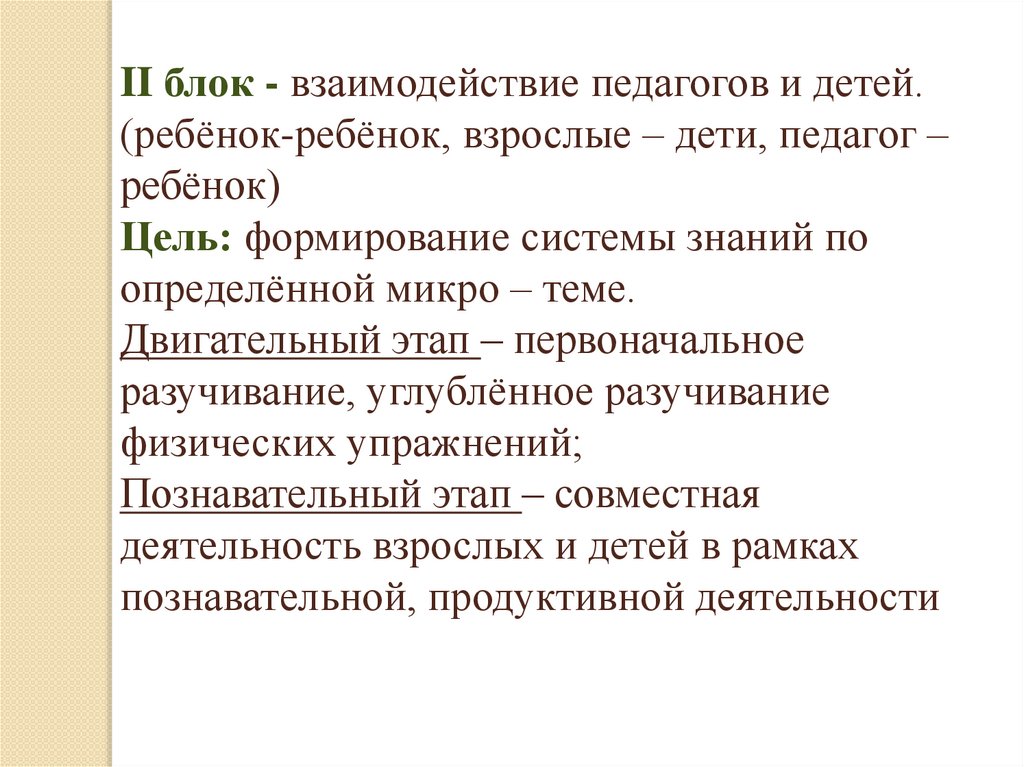 II блок - взаимодействие педагогов и детей.(ребёнок-ребёнок, взрослые – дети, педагог –