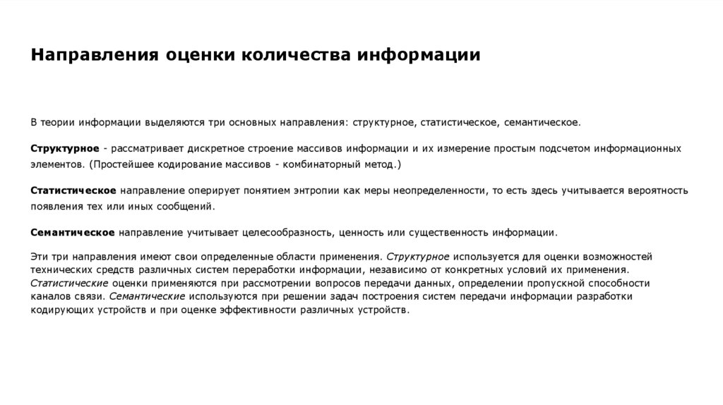 Направления оценки количества информацииВ теории информации выделяются три основных направления: структурное, статистическое, семантическое.