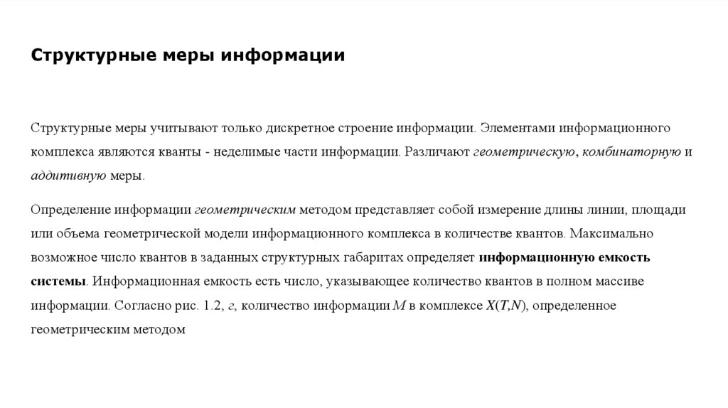 Структурное - рассматривает дискретное строение массивов информации и их измерение простым подсчетом информационных