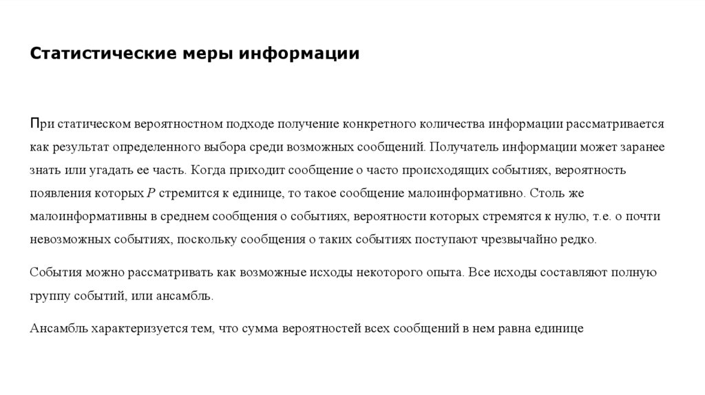 меньше эта вероятность, тем больше информации содержится в данном сообщении.
