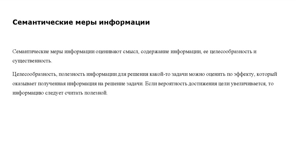Семантические меры информацииСемантические меры информации оценивают смысл, содержание информации, ее целесообразность и