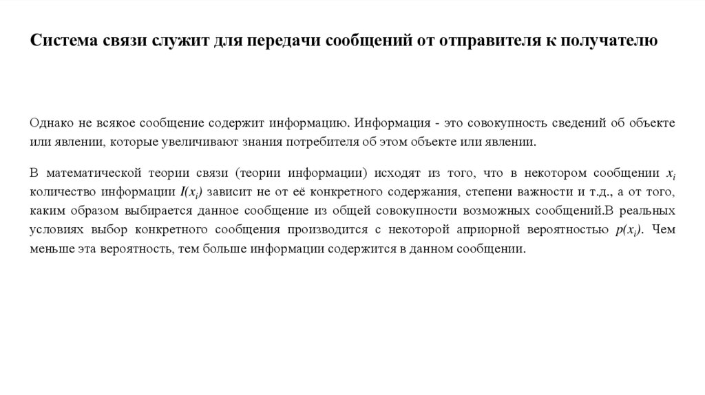 В математической теории связи (теории информации) исходят из того, что в некотором сообщении xi