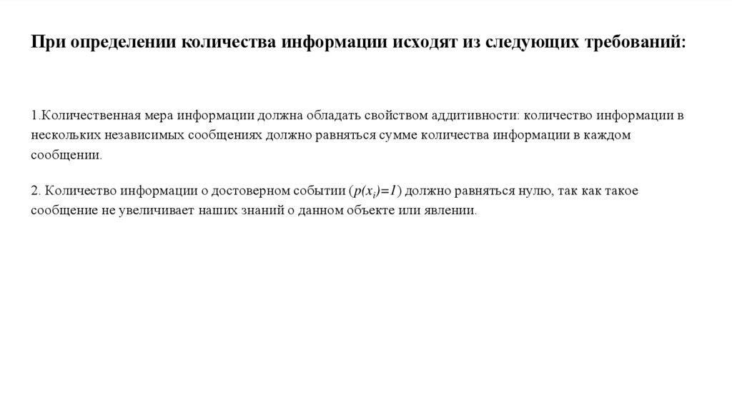 При определении количества информации исходят из следующих требований:1.Количественная мера информации должна обладать свойством аддитивности: количество информации в