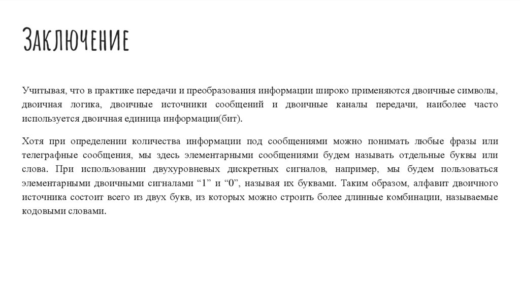 ЗаключениеУчитывая, что в практике передачи и преобразования информации широко применяются двоичные символы,