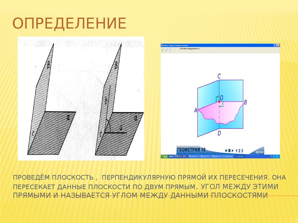 ОПРЕДЕЛЕНИЕПРОВЕДЁМ ПЛОСКОСТЬ , ПЕРПЕНДИКУЛЯРНУЮ ПРЯМОЙ ИХ ПЕРЕСЕЧЕНИЯ. ОНА