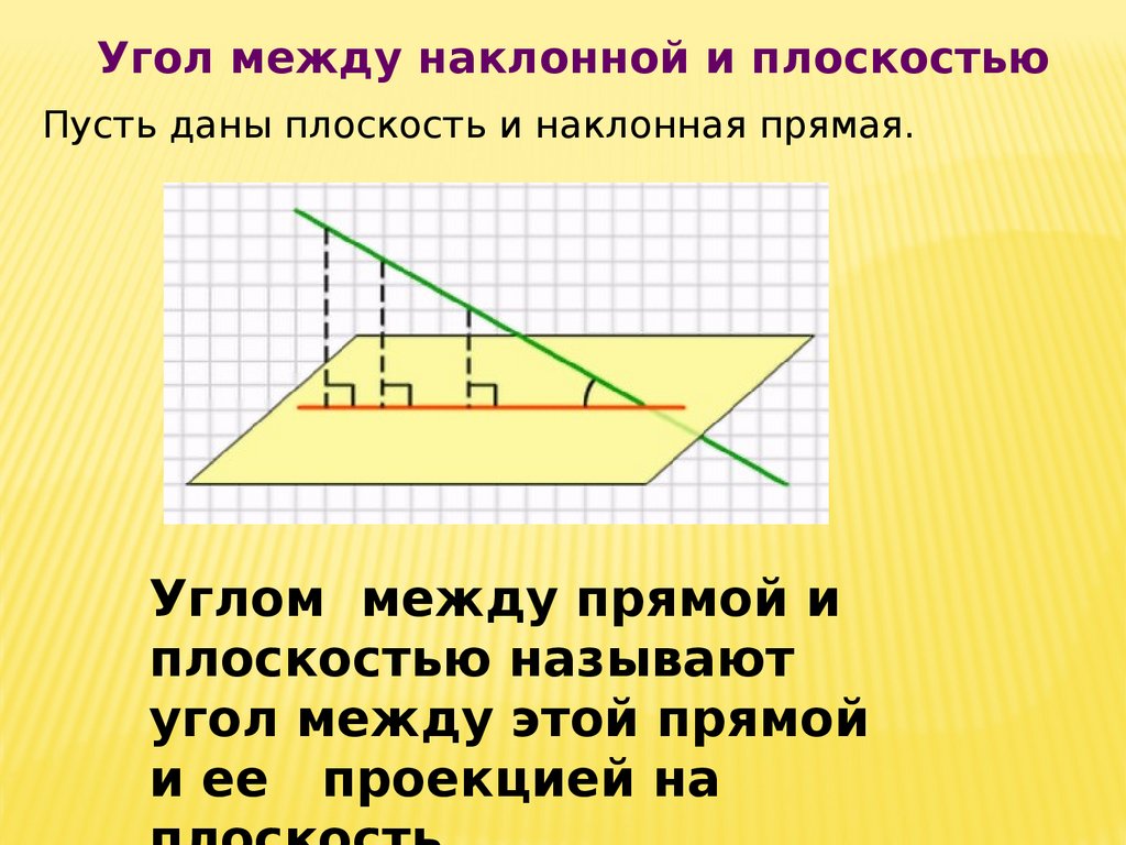 Угол между наклонной и плоскостьюПусть даны плоскость и наклонная прямая.