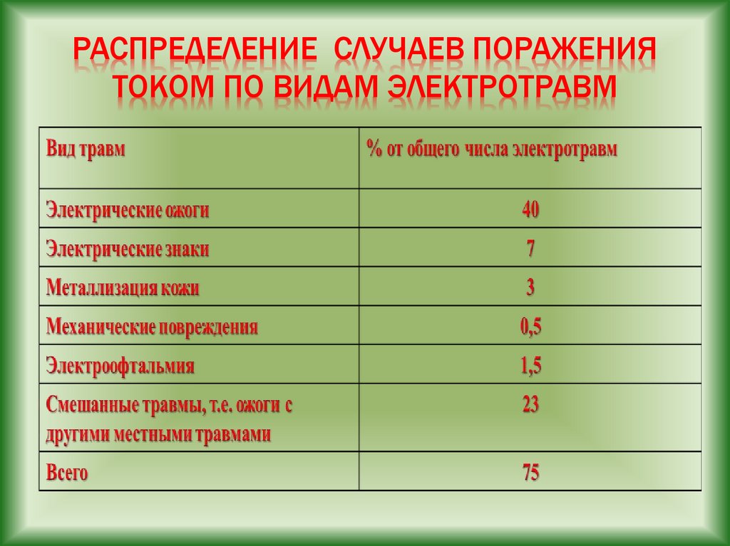 РАСПРЕДЕЛЕНИЕ СЛУЧАЕВ ПОРАЖЕНИЯТОКОМ ПО ВИДАМ ЭЛЕКТРОТРАВМ