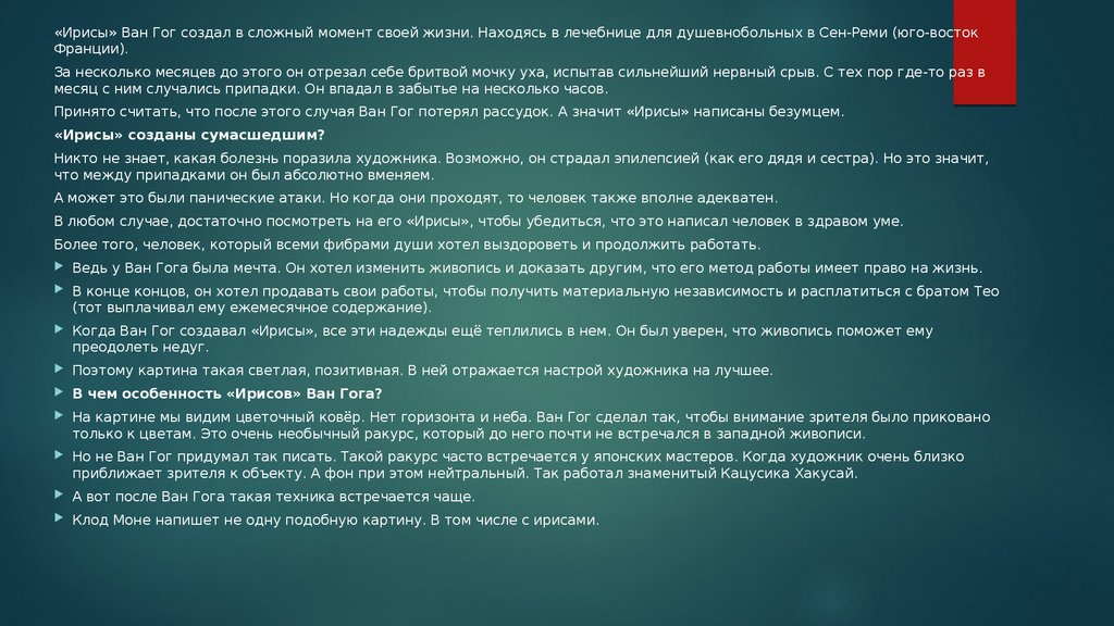 «Ирисы» Ван Гог создал в сложный момент своей жизни. Находясь в лечебнице для душевнобольных в Сен-Реми (юго-востокФранции).