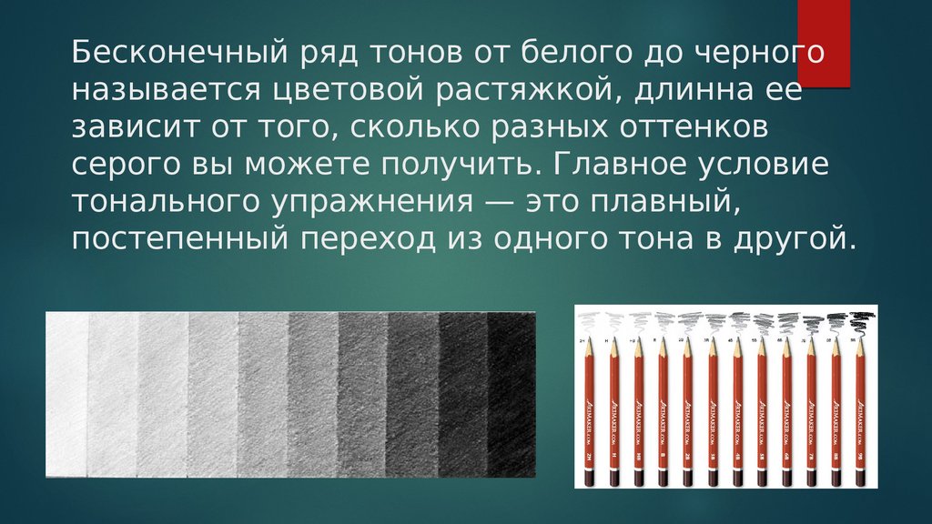 Бесконечный ряд тонов от белого до черногоназывается цветовой растяжкой, длинна ее
