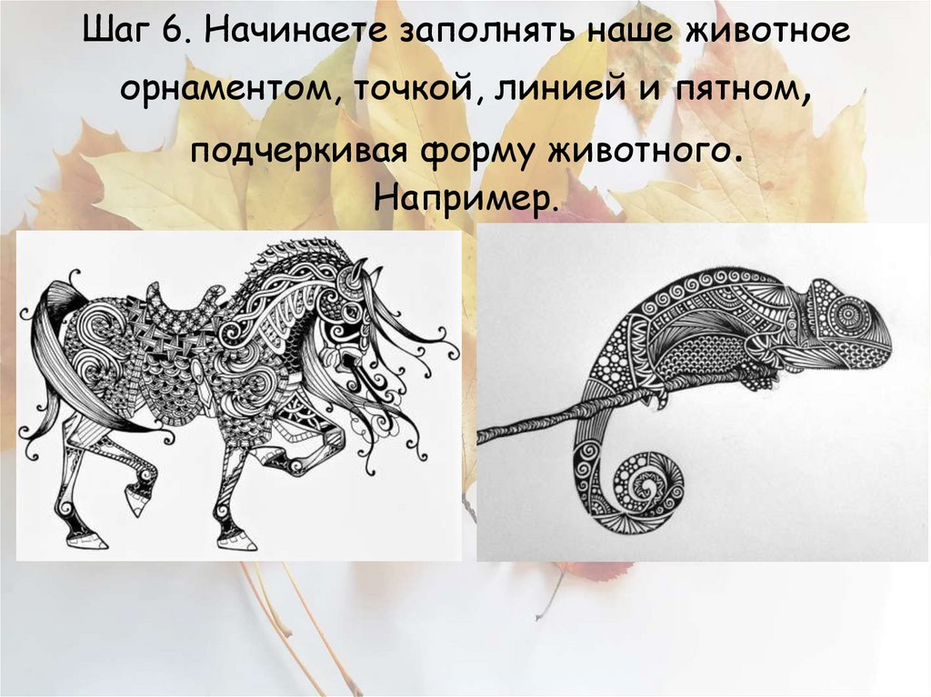 Шаг 6. Начинаете заполнять наше животноеорнаментом, точкой, линией и пятном,