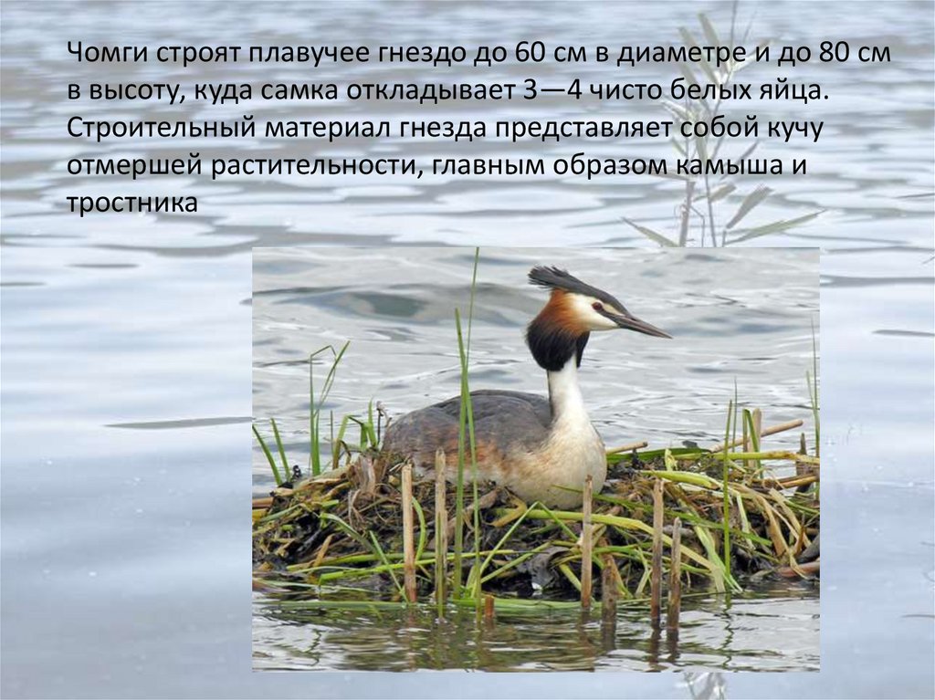 Чомги строят плавучее гнездо до 60 см в диаметре и до 80 смв высоту, куда самка откладывает 3—4 чисто белых яйца.