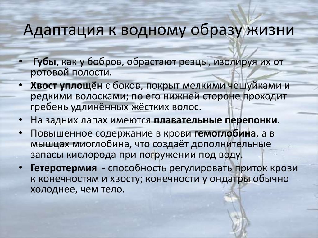 Адаптация к водному образу жизни• Губы, как у бобров, обрастают резцы, изолируя их от