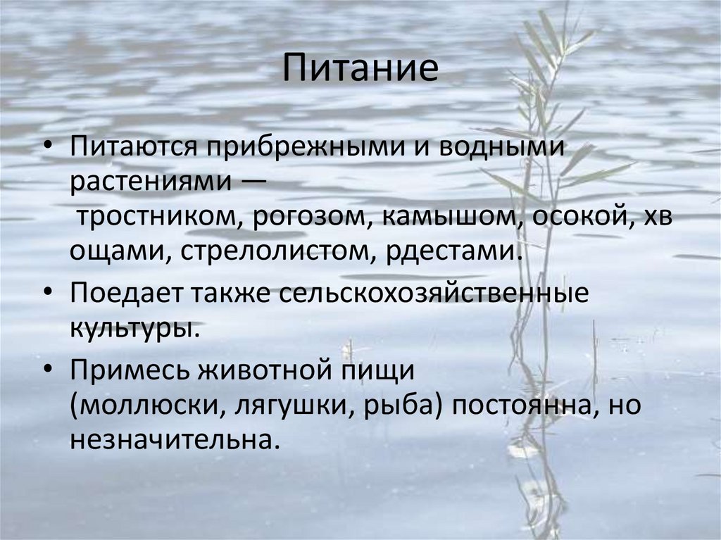 Питается молодыми побегами водных или околоводных травянистыхрастений