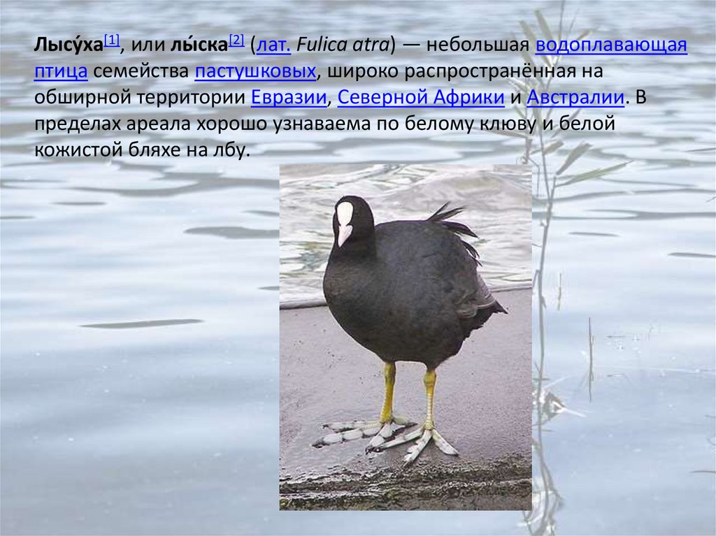 Лысу́ха[1], или лы́ ска[2] (лат. Fulica atra) — небольшая водоплавающаяптица семейства пастушковых, широко распространённая на