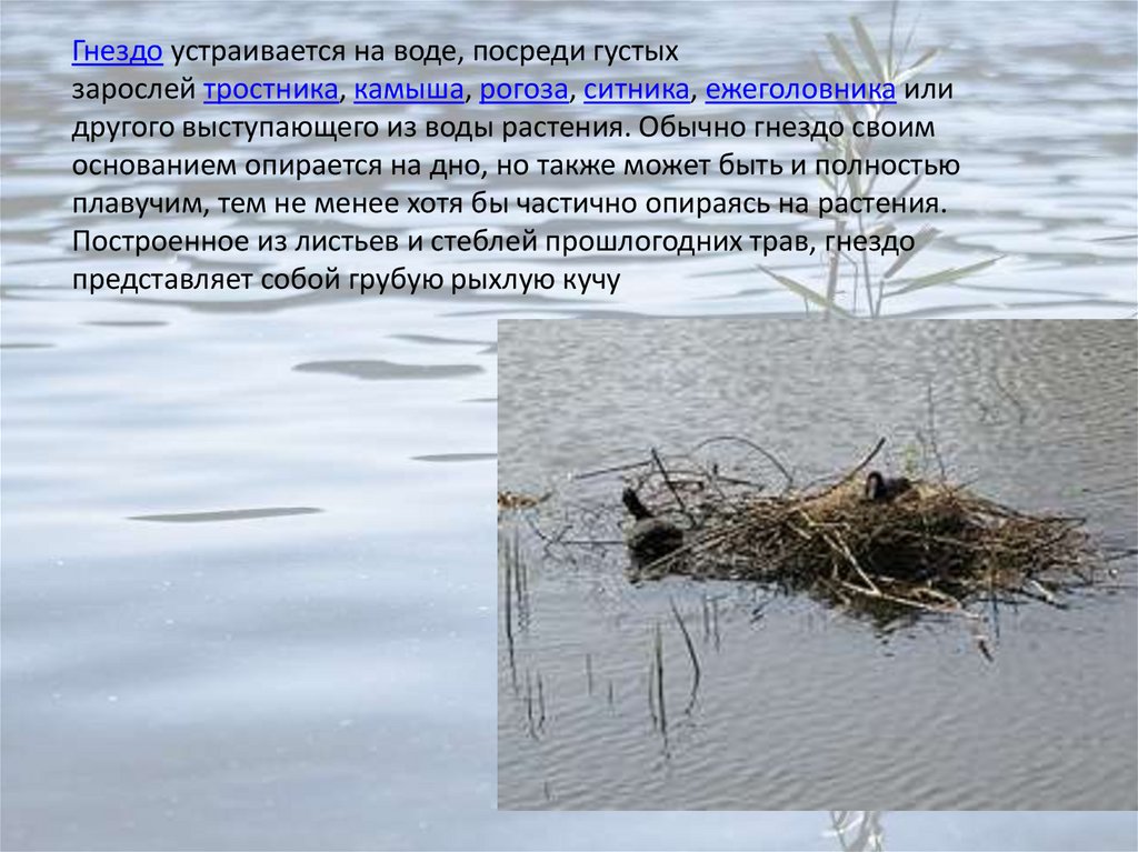 Гнездо устраивается на воде, посреди густыхзарослей тростника, камыша, рогоза, ситника, ежеголовника или