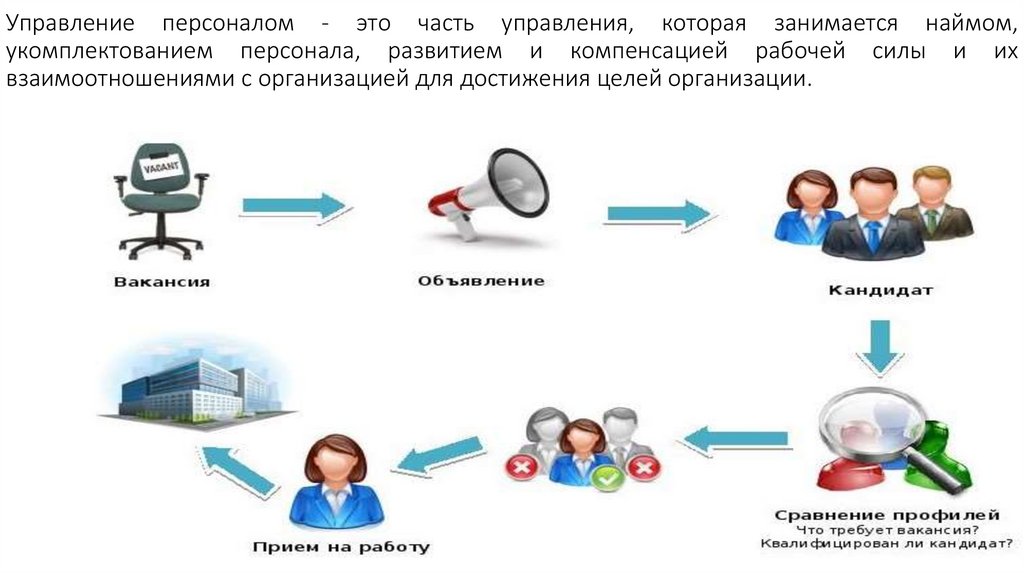 Управление персоналом - это часть управления, которая занимается наймом,укомплектованием персонала, развитием и компенсацией рабочей силы и их