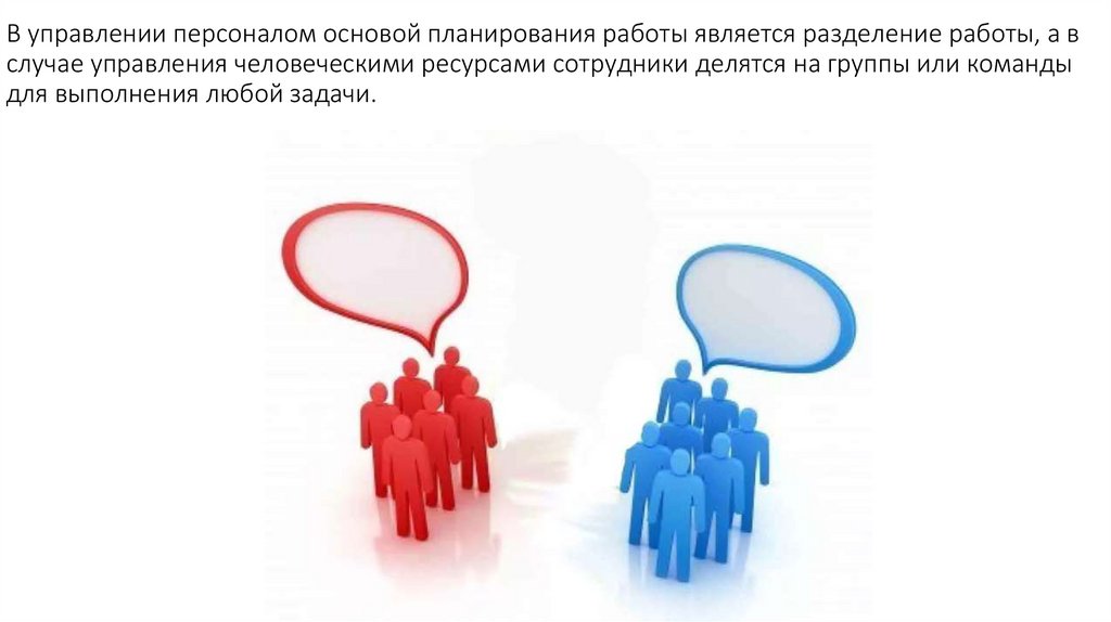 В управлении персоналом основой планирования работы является разделение работы, а вслучае управления человеческими ресурсами сотрудники делятся на группы или команды