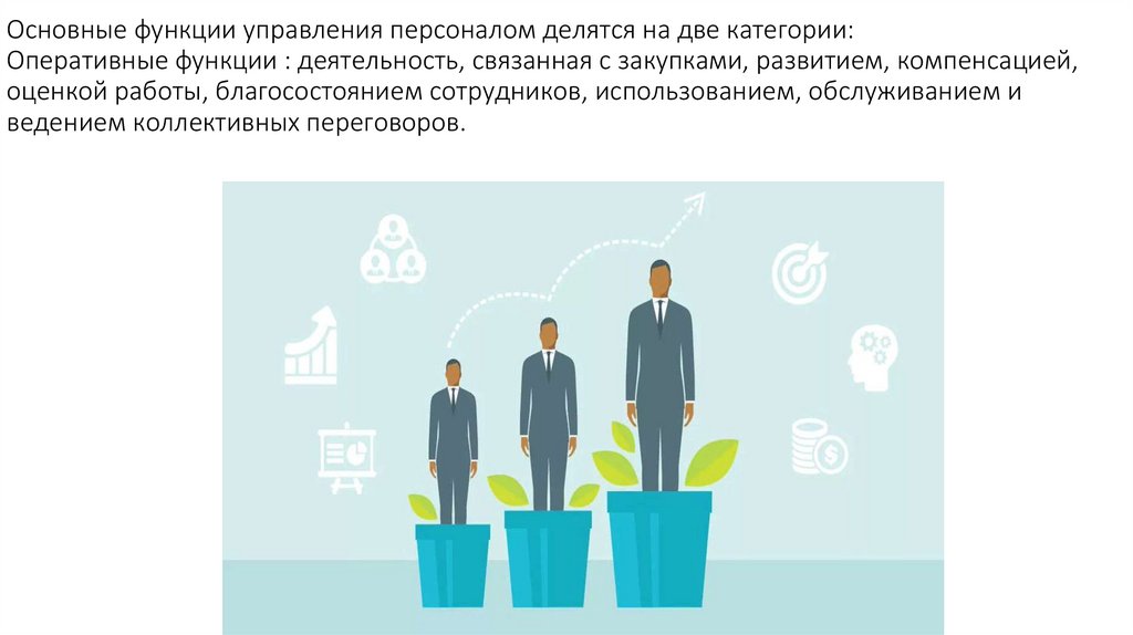 Основные функции управления персоналом делятся на две категории:Оперативные функции : деятельность, связанная с закупками, развитием, компенсацией,